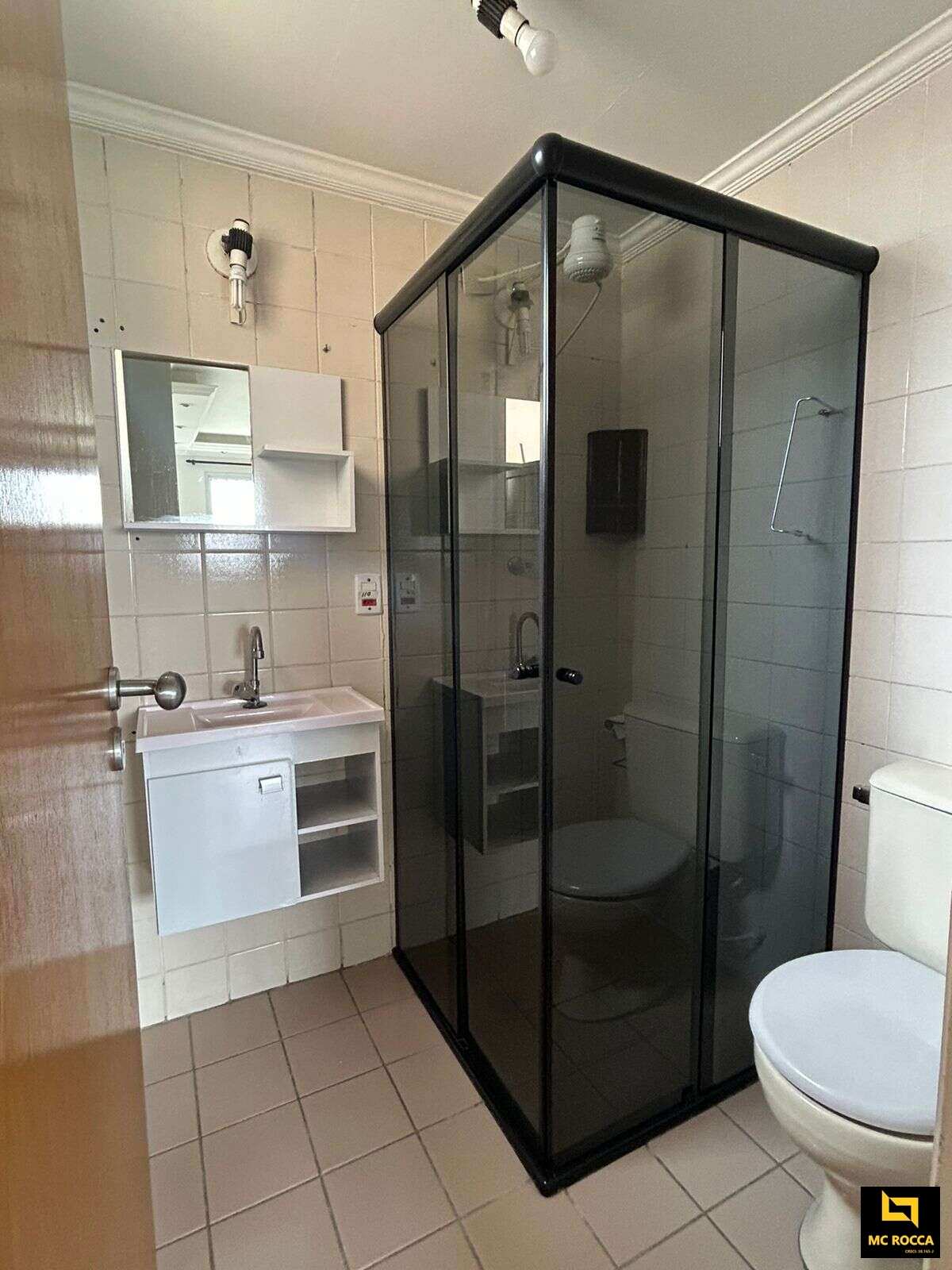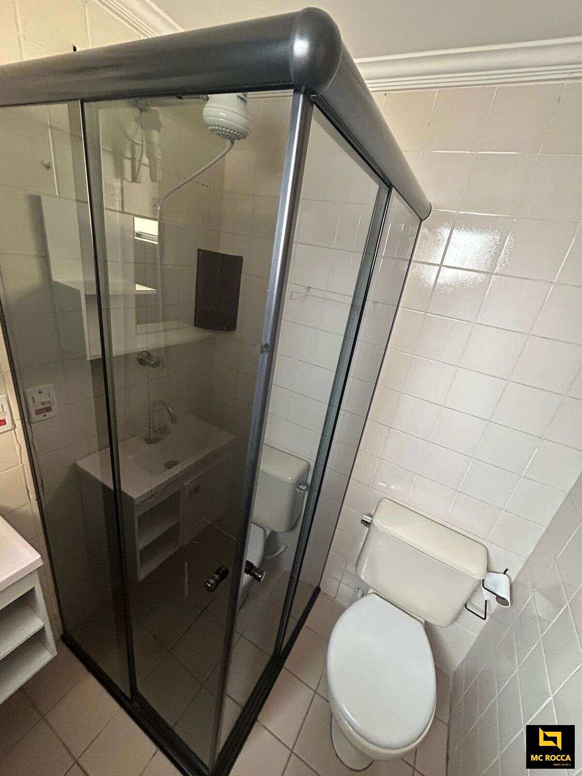 - Banheiro completo com box de vidro fumê, espelho e gabinete