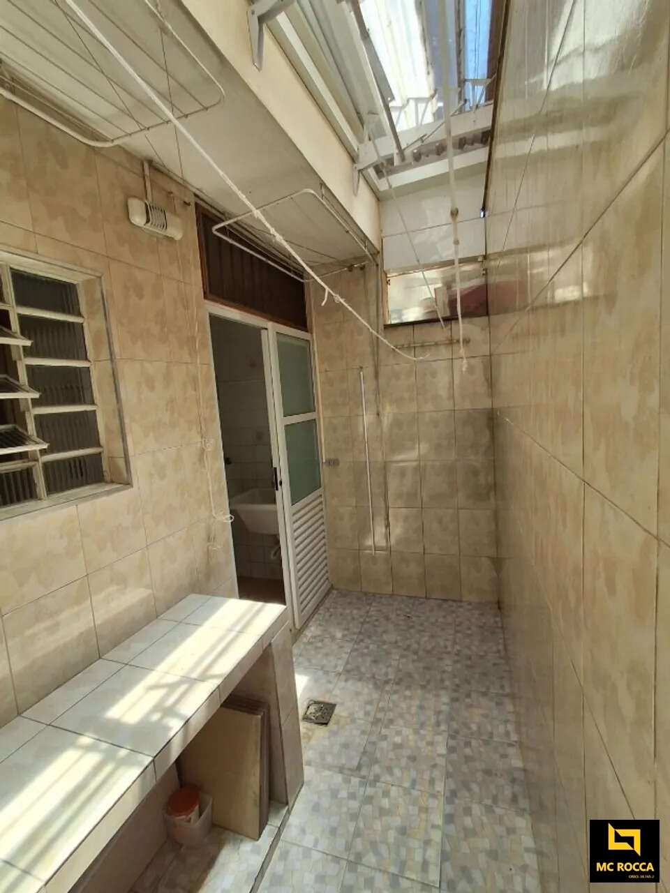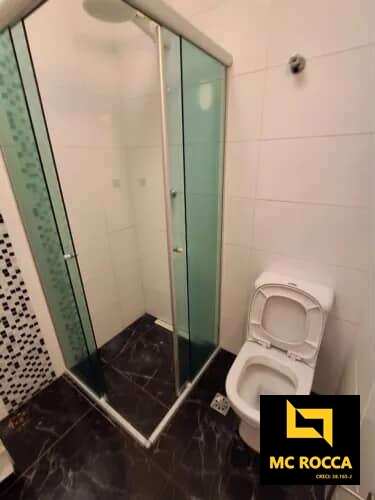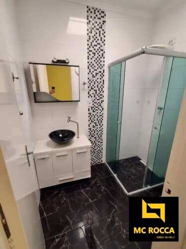 Sobrado em condomínio fechado em Santo André, com 2 dormitórios, sendo 1 com móveis planejados, banheiro social com box e gabinete, sala para dois ambientes com piso em porcelanato e estante, lavabo, cozinha planejada, lavanderia, pequeno quintal e 1 vaga de garagem coberta. O condomínio conta com área de lazer com jardim e bancos, além de câmeras de segurança e portão automático.